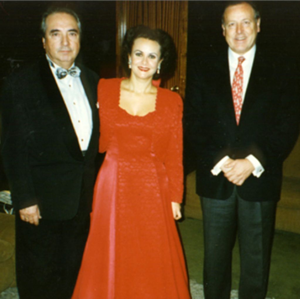 Carmen posing with the Mayor of Madrid and Conductor of the Madrid Symphony Orchestra, Enrique Garcia Asensio after a performance